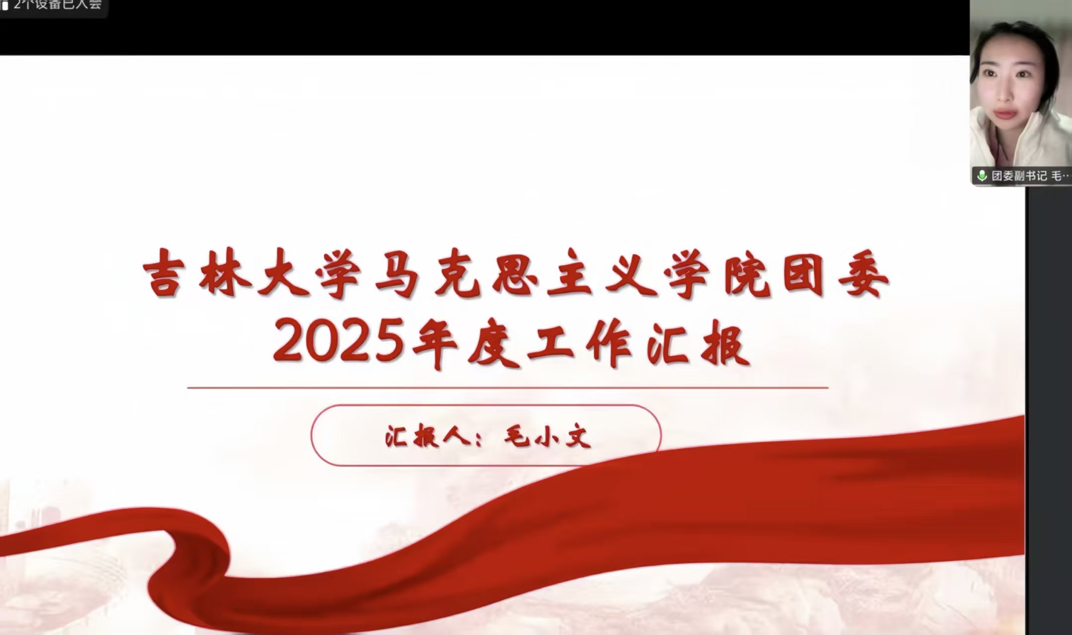 首先,团委副书记毛小文进行工作汇报。本年度,团委聚焦思想引领、文化育人、服务保障三个方面扎实推进各项工作:组织2023级、2024级硕博研究生集体观看《长津湖之水门桥》,以沉浸式观影强化爱国主义教育;在五一期间举办“春日寻芳”“精彩时光”主题摄影展,拓展美育实践形式;全力协办迎新晚会,保障活动顺利开展。同时,毛小文指出,当前工作中存在思想引领形式较为单一、活动体系化程度不高、服务覆盖面有待拓宽等方面的问题。对此,她表示团委将着力打造红色教育品牌、构建系列化文化IP、深化精准服务。