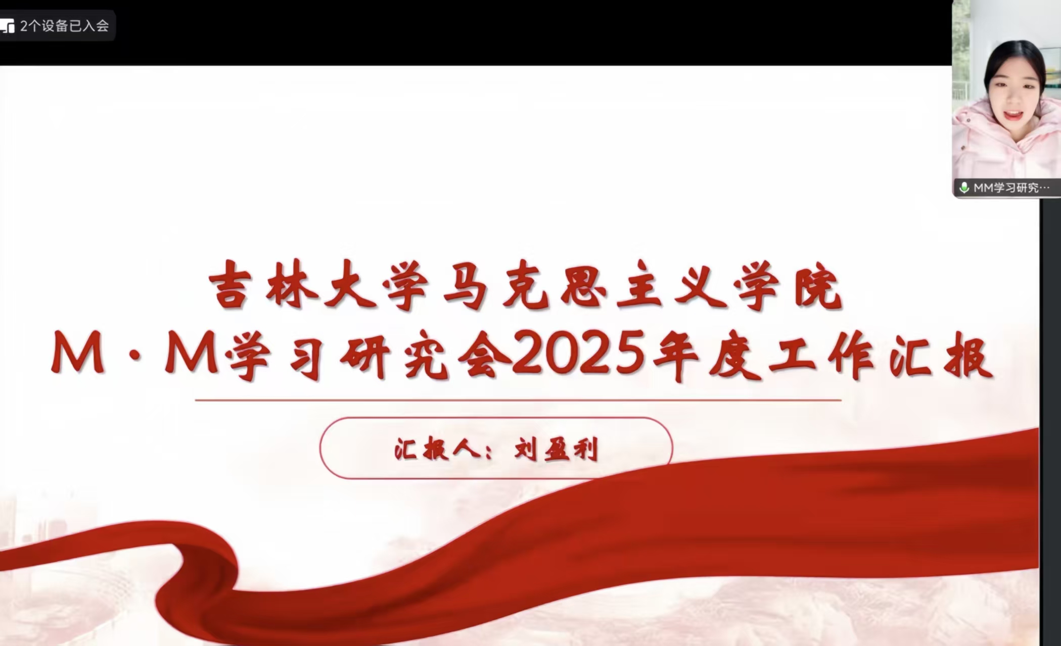 随后,M·M学习研究会主席刘盈利进行工作汇报。本年度,研究会通过举办新成员见面会、组织集体学习会等形式,围绕马克思主义经典理论与毛泽东思想开展领读研讨,在夯实团队基础的同时有效提升了成员的理论素养。同时,刘盈利指出,当前工作中存在活动形式单一、校园辐射力不足的问题。为此,研究会将在新的一年拓展实践维度,赴东北抗联陈列馆研学并与红石榴社团合作,同时丰富活动形式、加强组织协作,扩大社团影响力,推动马克思主义理论校园传播与实践。
