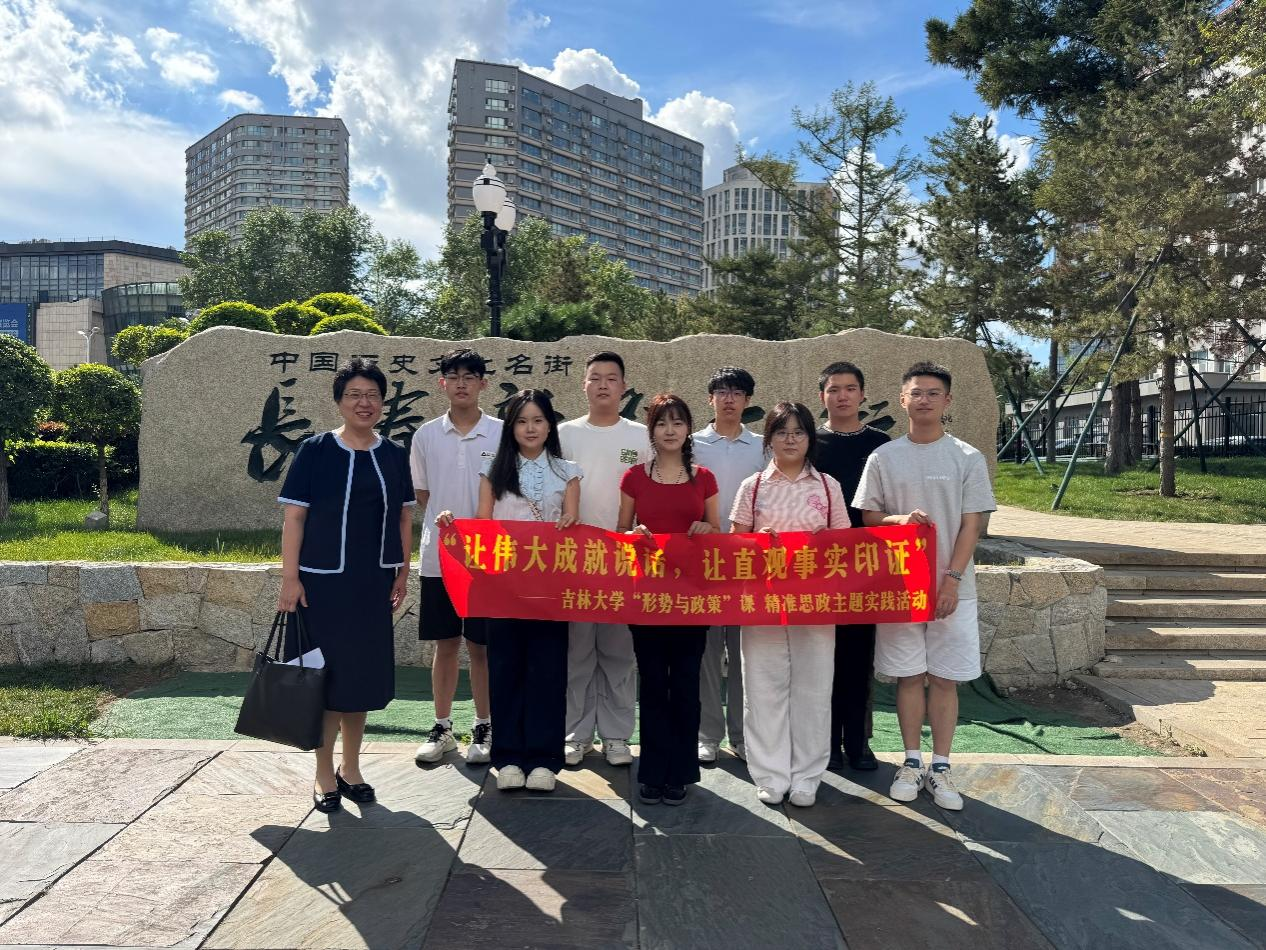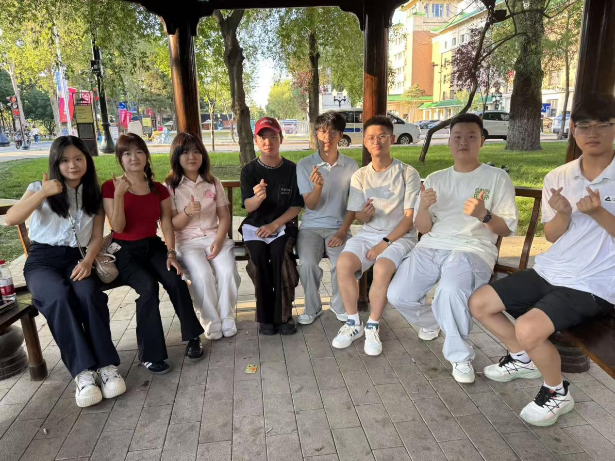 沿着新民大街向北行进,首站抵达“中国历史文化名街”石碑前。同学们立刻按照脚本分工行动:有的蹲在石碑旁整理采访设备,有的对照资料确认石碑镌刻的文字细节。拍摄正式开始时,导演闫策首先拍摄,介绍此次活动的背景:“1445米的长度,藏着72年的名字变迁——从1933年的‘顺天大街’,到1948年解放后的‘新民大街’;从文档里记载的‘基础设施老化、建筑破败’,到如今的‘国家历史文化名街’。这条路上,不仅有城市更新的密码,更链接着振兴东北的使命:如何让历史成为振兴的养分?如何让发展带着东北的温度?这正是我们要寻找的‘大思政课’答案。“随后孙鹤珊同学指着石碑向同学们介绍到:“2012年它入选‘中国历史文化名街’时,周边还比较破败,现在再看,街道整洁,建筑完好。”话音未落,程骏琪突然举手:“设计师太用心了——在伪满建筑旁特意设置红色文化地标,用‘殖民建筑’与‘抗联精神’的对比,无声地告诉我们:忘记历史就意味着背叛,铭记历史才能开创未来。”大家当即调整镜头,捕捉下这一“历史与精神对话”的画面,负责录音的同学还特意收录了风吹过雕像的轻微声响,“这是最真实的‘背景音’!”