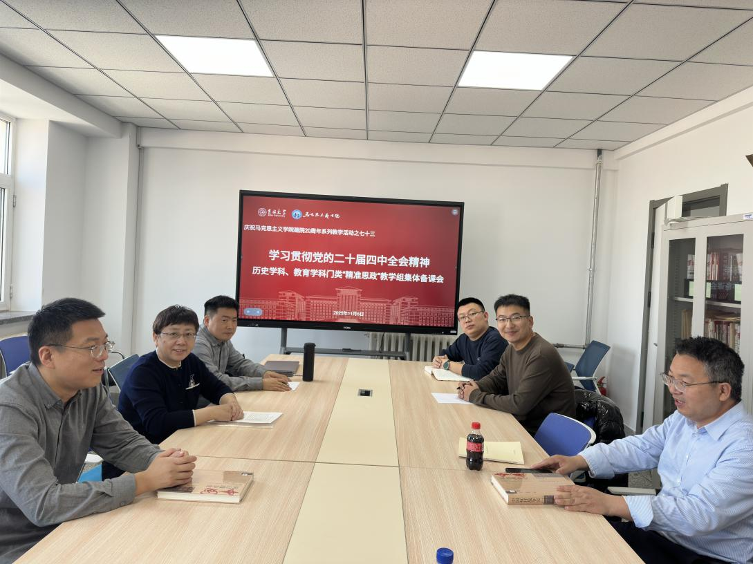 为深入学习贯彻党的二十届四中全会精神,推动全会精神精准融入课堂教学,2025年11月6日上午,历史学科和教育学学科门类“精准思政”教学组联合召开集体备课会,专题学习研讨党的二十届四中全会精神。本学期为史学、教育学科门类学生讲授思政课的教学组全体教师参加会议,会议由近现代史纲要教研室主任王广义教授主持。