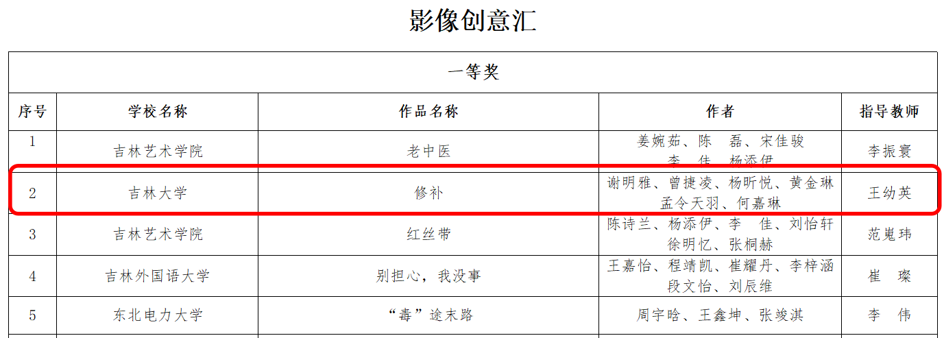 谢明雅、曾捷凌、杨昕悦、黄金琳、孟令天羽、何嘉琳同学共创作品《修补》荣获第八届吉林省大学生网络文化节“影像创意汇”一等奖。