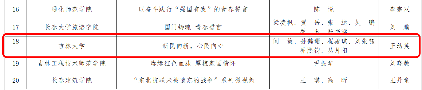 闫策、孙鹤珊、程骏琪、刘张钰、乔熙钧、丛月阳同学共创作品《新民向新,心民向心》荣获第八届吉林省大学生网络文化节“光影趣青春”一等奖。