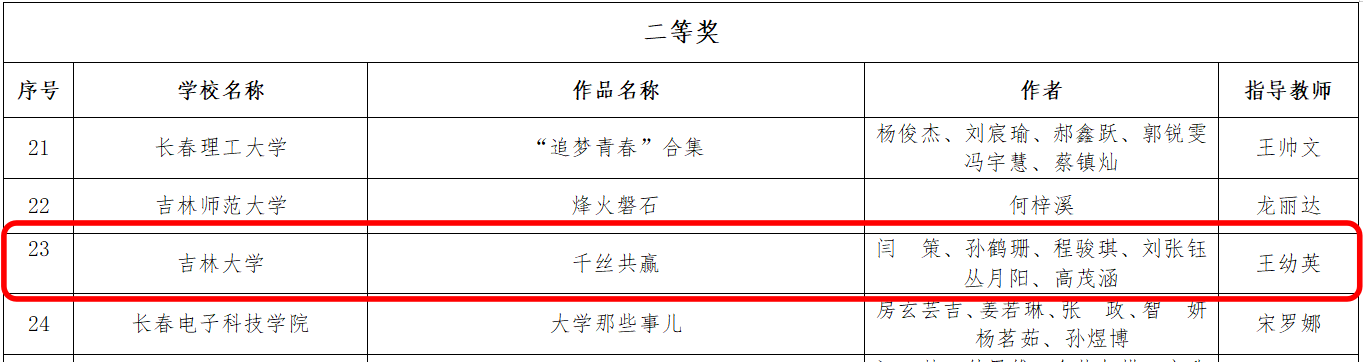 闫策、孙鹤珊、程骏琪、刘张钰丛月阳、高茂涵同学共创作品《千丝共赢》荣获第八届吉林省大学生网络文化节“光影趣青春”二等奖。