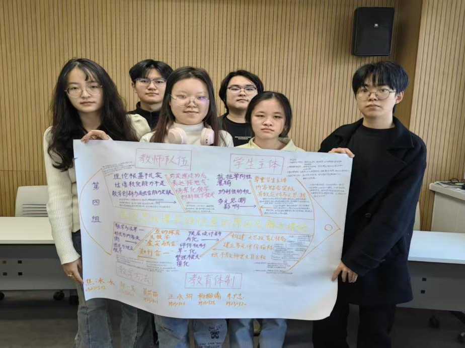 第四小组由组长邹一茗全程把控节奏,先拆解出教师队伍、学生主体、教学方法、教育体制四大分析维度,再引导成员逐维度深挖问题。焦冰冰、葛芮萌聚焦教师队伍理论转化能力不足、教学方法固化等核心问题;汪永翔、杨撷鼎梳理出学生功利性学习动机、评价机制单一化等痛点;朱广志负责整合观点,针对性提出“构建大思政育人格局”“赋予教师更大教学自主权”等解决措施。最终形成的鱼骨图清晰呈现问题的因果逻辑与改进路径,成果兼具系统性与实操性。