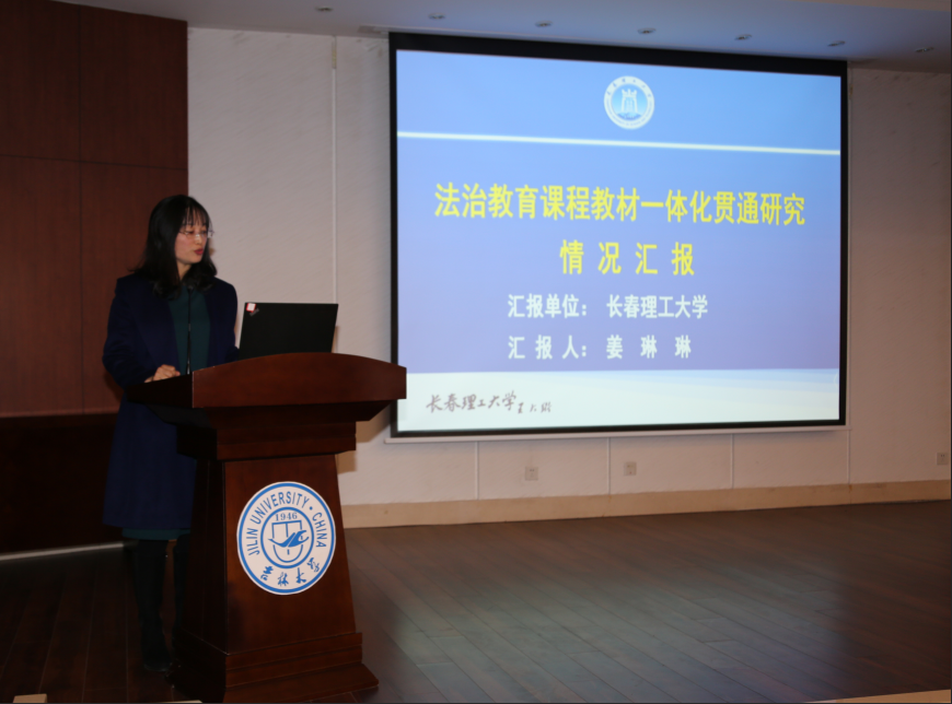 长春理工大学课题组针对“法治教育课程教材一体化贯通研究”进行情况汇报。她详细说明该课题组进行教学指南编写时注重的三个原则,即精确对接政策要求、精心提炼衔接主题、精准服务教学实践等;提出教学目标的分阶递进、探讨衔接主题的五个维度并最终指明教学实践的实用性和可操作性。