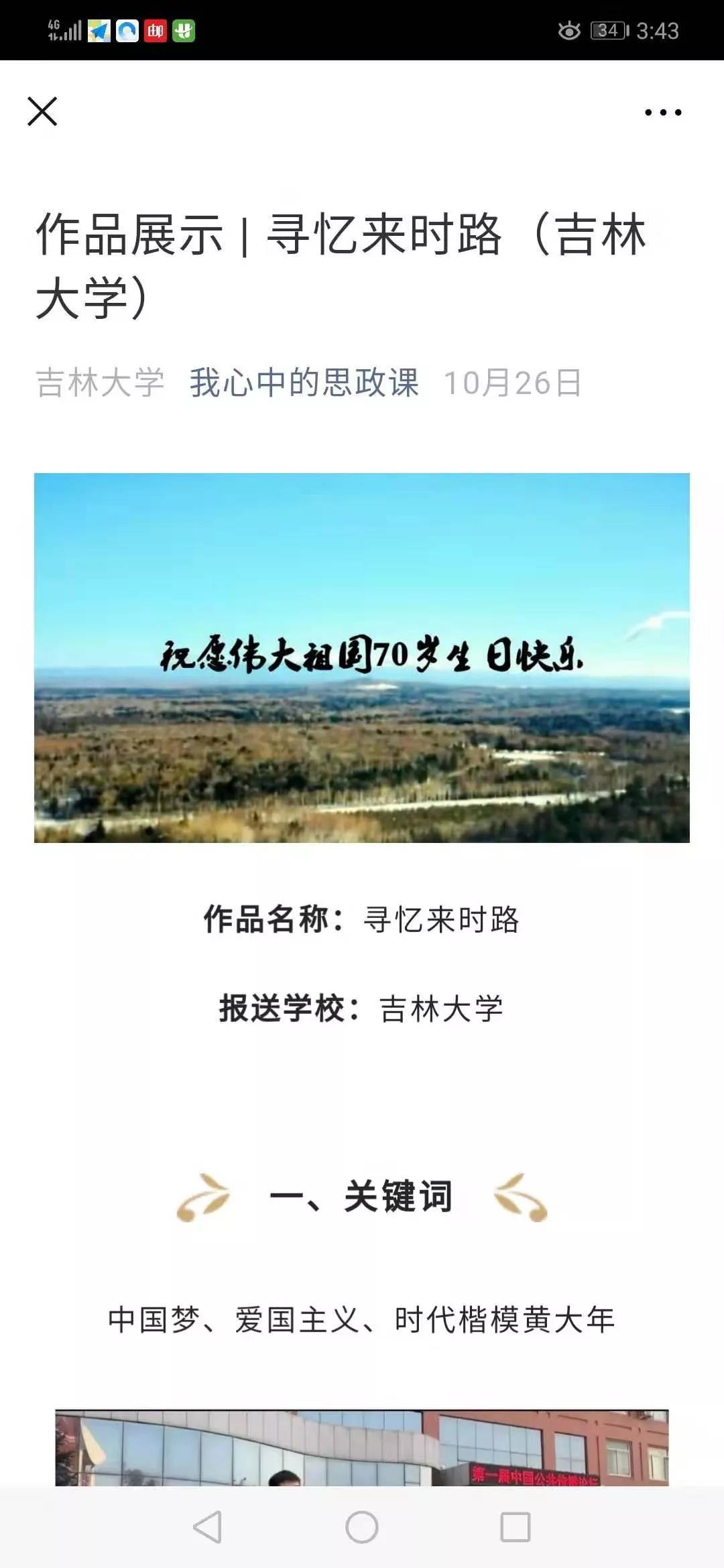 的石瑛、刘卓、严俊、杨一博担任指导教师。影片以中国梦和爱国主义精神为主题,讲述了一名大学生在思政课上观看了时代楷模黄大年的相关影像资料后,产生了对“爱国主义精神究竟是一种什么样的力量”的疑惑。带着这个疑惑,她走入校史馆探查历史的脉络,感受蕴含于祖国七十年发展中的中国梦内涵,表达了当代青年大学生强烈的爱国主义精神、对祖国最诚挚的爱意和实现中华民族伟大复兴中国梦的坚定信心。