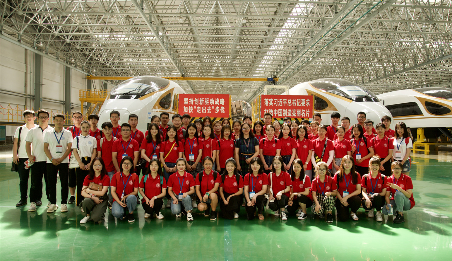经过讲解,同学们了解到中车集团贯彻落实习近平总书记的要求与殷切希望,将高铁打造为我国装备制造的一张亮丽的名片。中国中车研制的具有完全自主知识产权、达到世界先进水平的中国标准动车组被命名为“复兴号”。“复兴号”具备的创新性、安全性、经济性、人性化、智能化、标准化六大特点,它的诞生意味着我国高铁的国际话语权和核心竞争力的增强。在参观过程中,同学们发现中国中车不仅是一个具有强大技术的公司,也是一个十分注重文化建设的集团。中国中车十分注重党政文化的宣传工作,生产车间中随处可见体现党政文化的展板与标语。此外,中国中车在动车组列车制造过程中实行实名制作业。一方面能够保障列车的质量,另一方面也可以让列车带着工人的工号走遍祖国大江南北,激发工人的自豪感与荣誉感。此外,中国中车集团肩负着国有企业的使命,在注重自身的建设与发展的同时致力于推动中国高端设备走向世界。2014年10月,在习近平总书记及普京总统的见证下,中国中车代表中国与俄罗斯西纳拉集团签署轨道交通装备制造合资公司设立合同。2014年10月,中车长客中标美国马萨诸塞州波士顿红橙线地铁项目,这是中国高端装备首次成功进入美国,这对“中国制造”品牌形象的提升具有重要的战略意义。