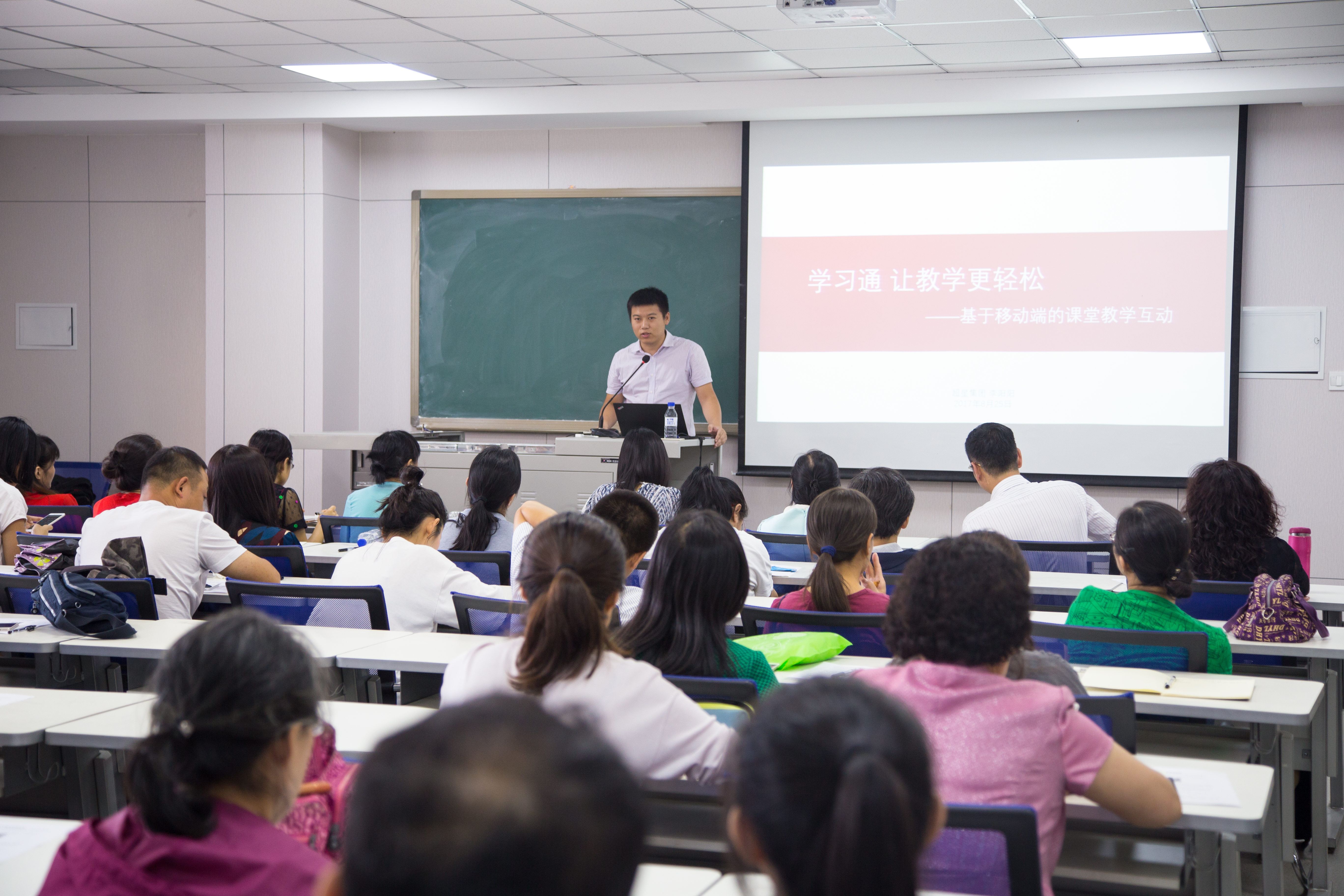 北京超星公司产品部总监李阳阳从智能手机学习在移动学习、实时互动、因材施教等方面所表现出的独特优势出发,向大家重点介绍了超星公司开发的对接教学需求的移动端课堂教学工具——超星学习通。超星学习通拥有海量资源,便于教师备课与分享;即时反馈,使教师即时了解学情、高效管理课程;更多沟通,让师生互动更加轻松;大数据,让考核评价更轻松。老师们现场下载软件,边听讲解边操作,并实时互动和提问。