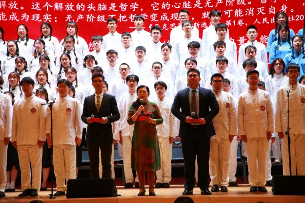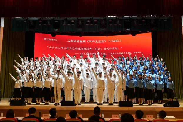 当诵读到马克思恩格斯《共产党宣言》,红船队、青马队全体呐喊出“让统治阶级在共产主义革命面前发抖吧!无产者在这个革命中失去的只是锁链,他们获得的将是整个世界。全世界无产者,联合起来!”这一经典段落时,群情激昂、热血沸腾、气势恢宏,全场掌声雷动。