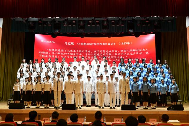 从马克思的《<黑格尔法哲学批判>导言》《1844年经济学哲学手稿》《关于费尔巴哈的提纲》,到马克思恩格斯的《德意志意识形态》《共产党宣言》,到恩格斯的《在马克思墓前的讲话》《路德维希费尔巴哈和德国古典哲学的终结》,到列宁的《帝国主义是资本主义的最高阶段》,再到毛泽东的《实践论》《矛盾论》,再到邓小平的《解放思想实事求是团结一致向前看》《在武昌、深圳、珠海、上海等地的谈话要点》,最后到习近平的《在纪念马克思诞辰200周年大会的讲话》,一部部经典著作的经典论述喷涌而出。“红船队”和“青马队”两支队伍思想竞放,或深刻论理、或庄严宣誓,不时引起阵阵掌声。