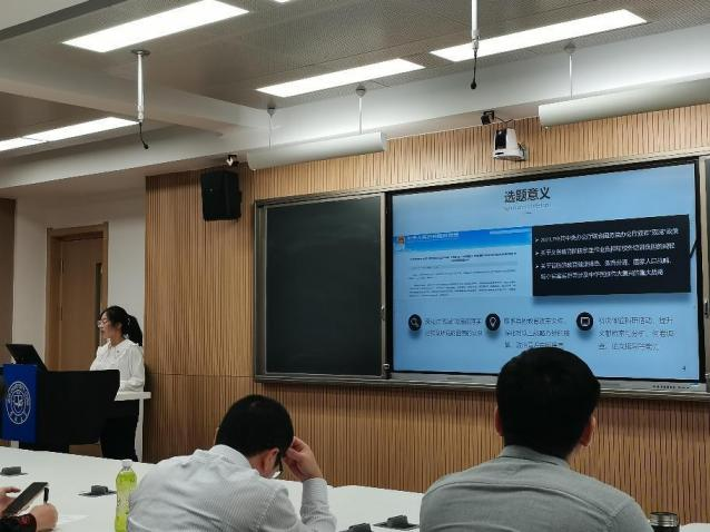 2020级本科生吴童童首先从国家政策层面出发点明了项目的重要意义,紧接着介绍了项目在调研报告、学术论文等方面的成果,最后总结了项目团队在研究过程中的成长。评审老师充分肯定吴童童小组的研究成果,并提出了“政策研究范式”,建议该小组可以从梳理政策的背景、脉络、理论入手展开进一步的研究。