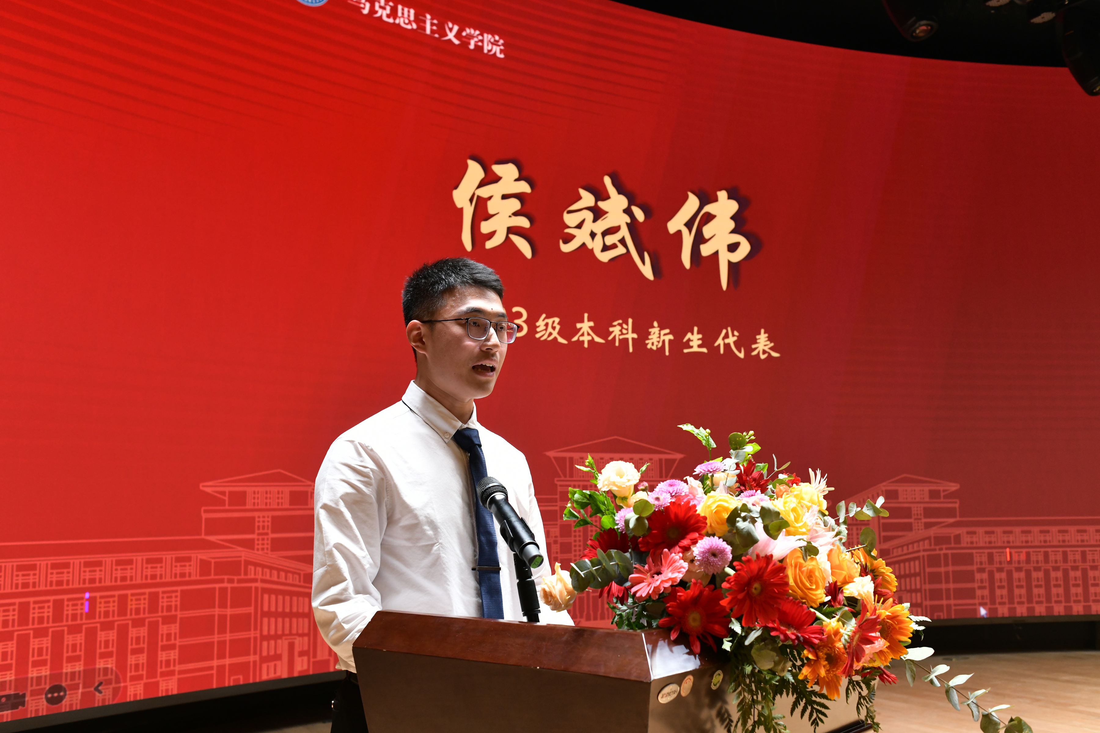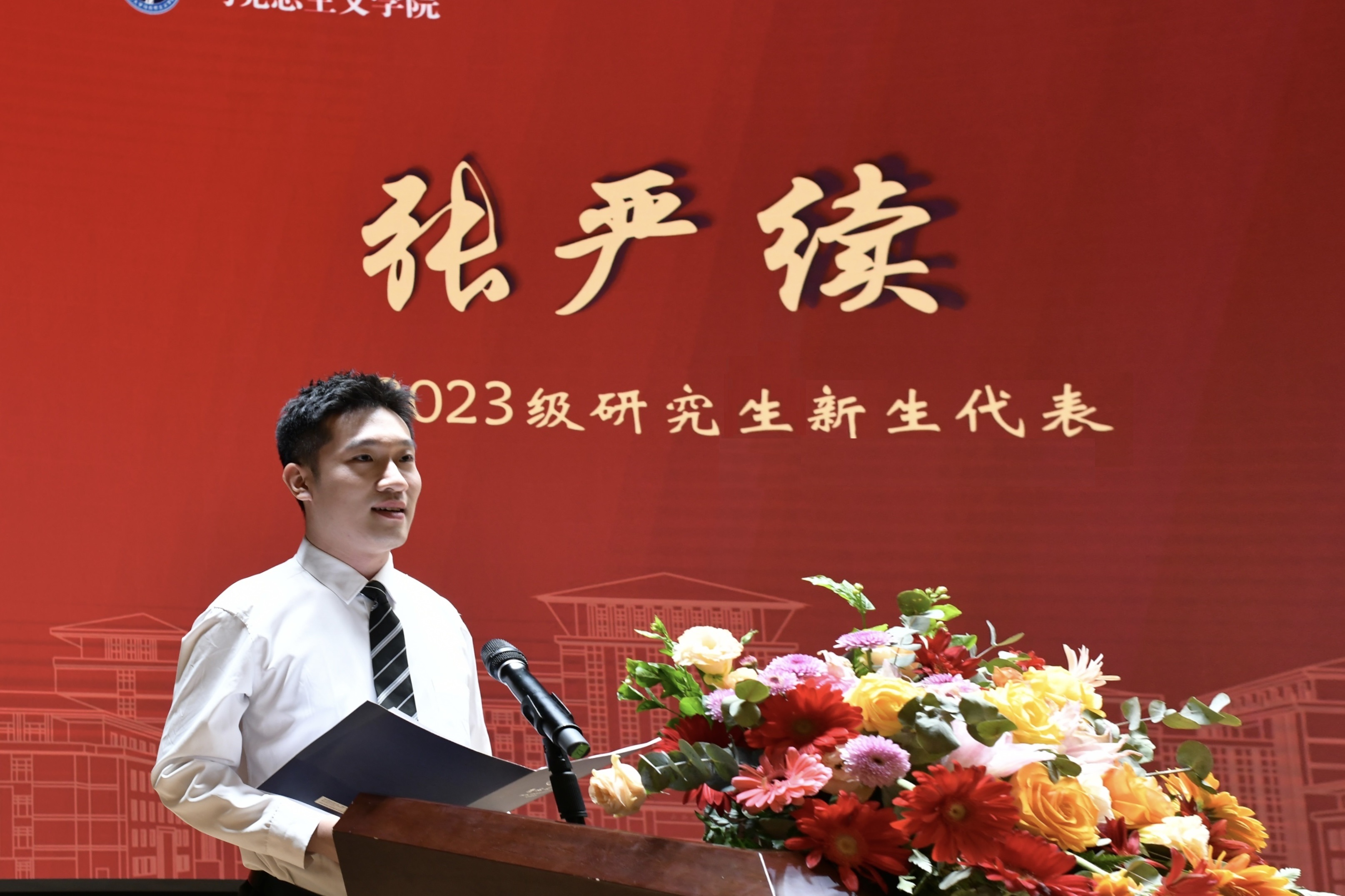 2023级本科生新生代表侯斌伟、研究生新生代表张严续分别进行发言。侯斌伟同学谈到,通过阅读马恩著作,他深切感受到马克思伟大的价值观、择业观、友谊观、爱情观对于我们解答人生困惑、作出正确人生抉择具有的指导意义,相信通过日后的学习,马院学子对于马克思主义的坚定信仰一定能够在知情意行的统一中得到生动诠释。张严续同学表示,马克思所写的《青年在选择职业时的考虑》为他明晰了未来职业的方向——选择为人类服务的职业,为最大多数人的幸福而工作。并以此勉励大家,要坚定“为天地立心,为生民立命”的高尚理想信念。