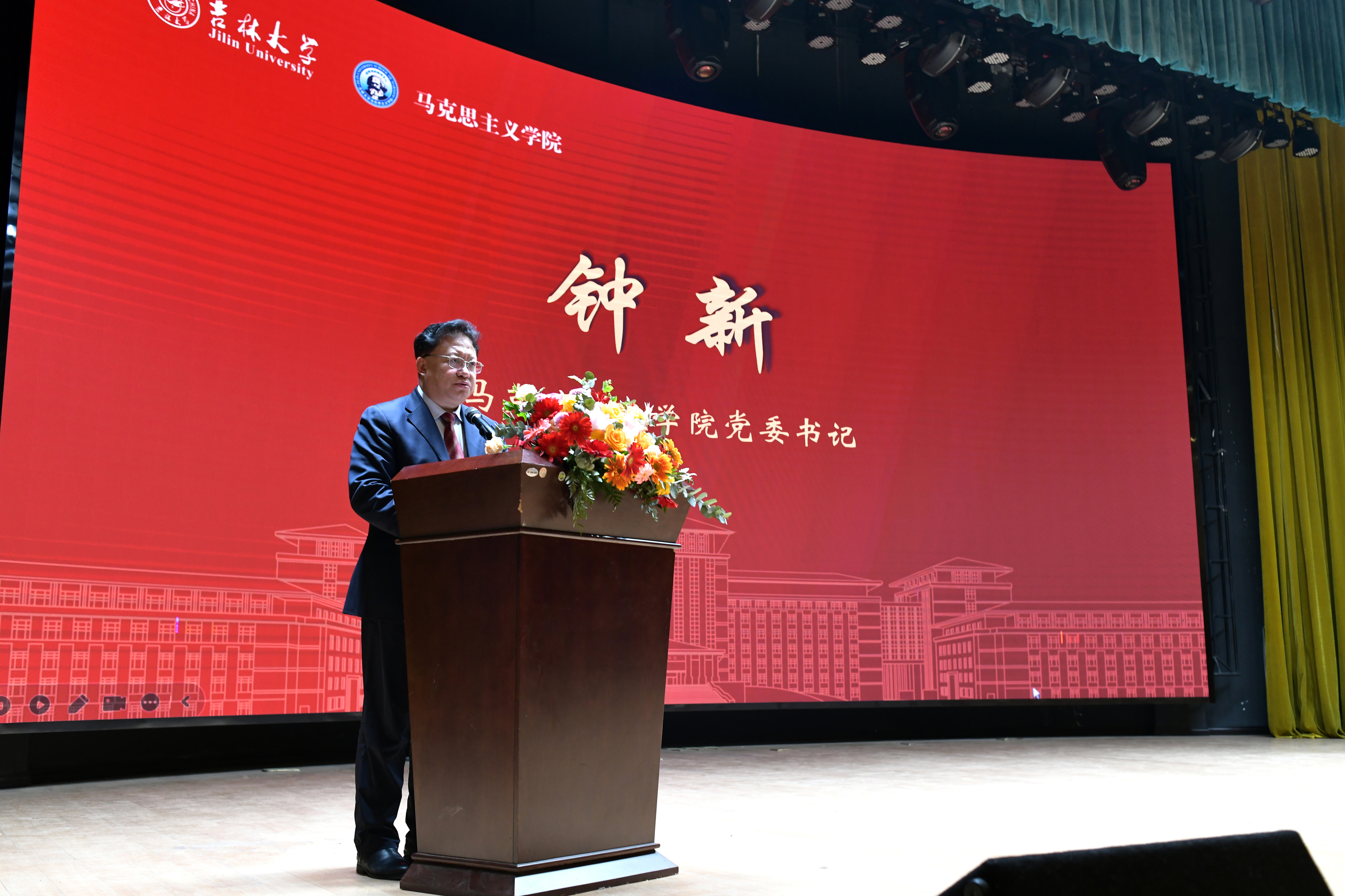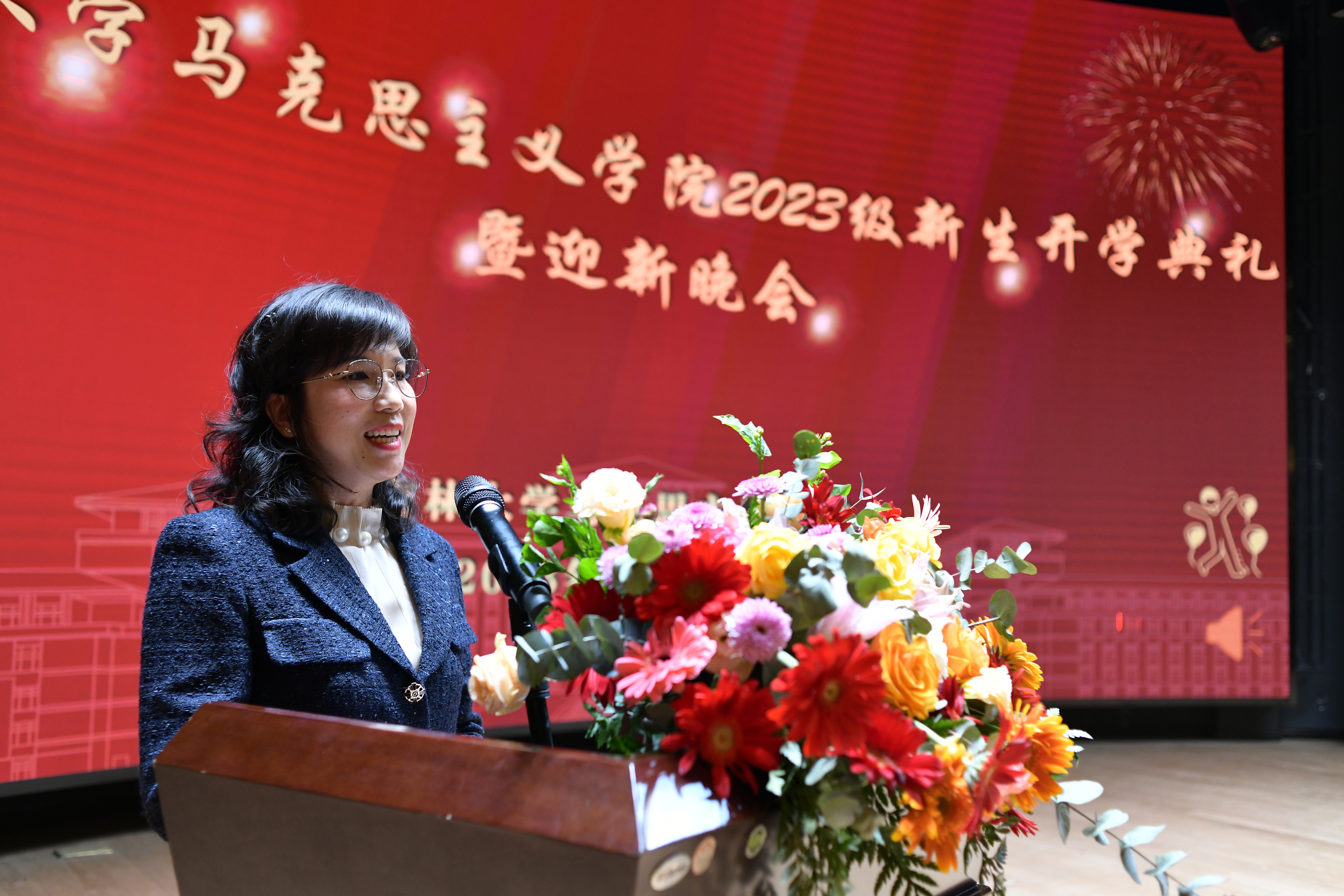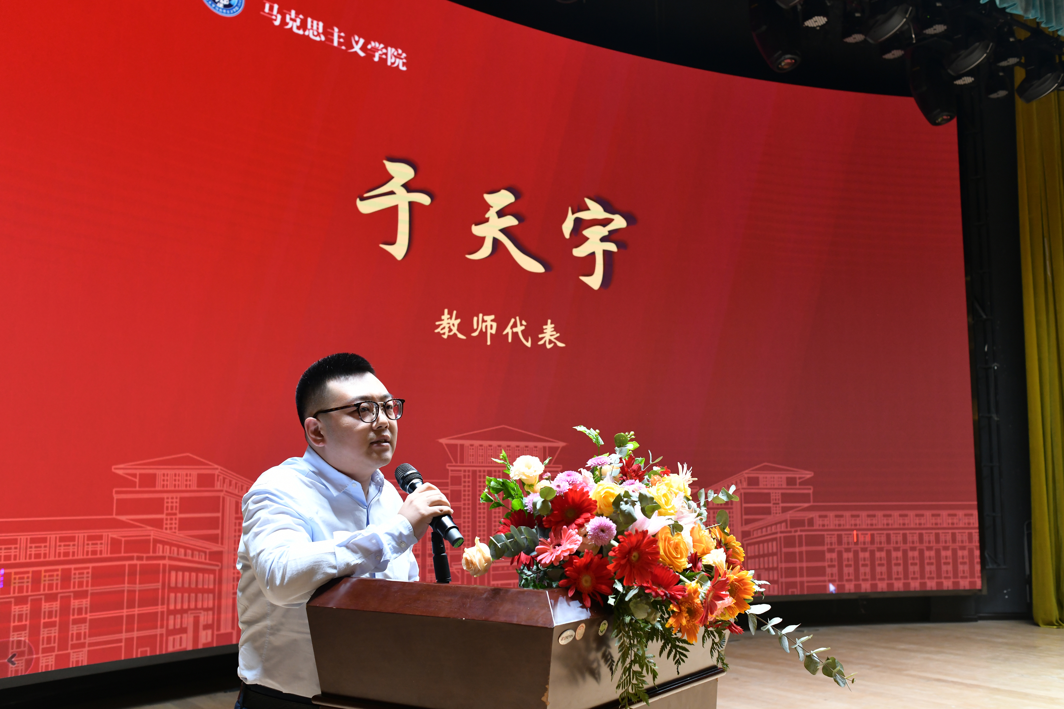教师代表发言。于天宇向新生同学提出了三点殷切嘱托:珍惜时间、热爱生活、努力学习。希望同学们可以通过吉大马院这个优秀的平台迈上人生的新境界,扬鞭脚下,踏梦而行,不负韶华。