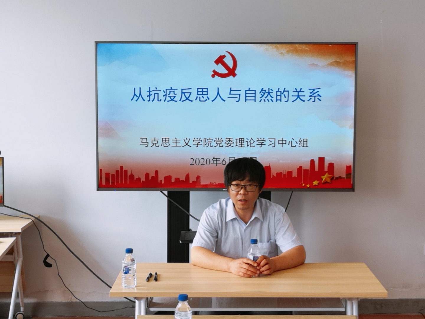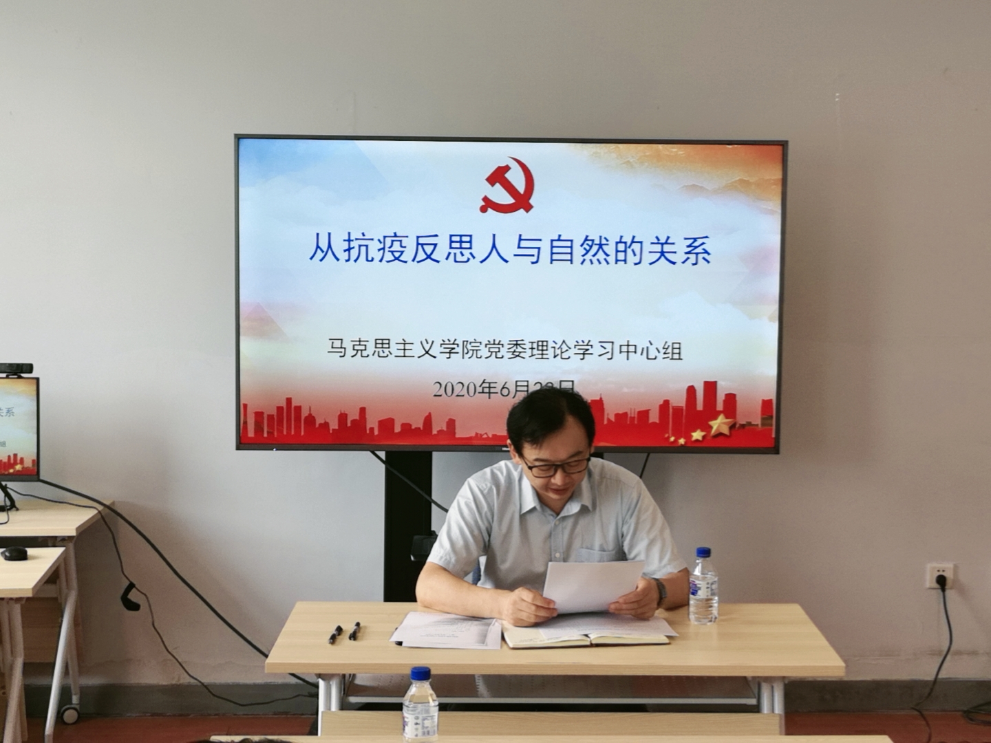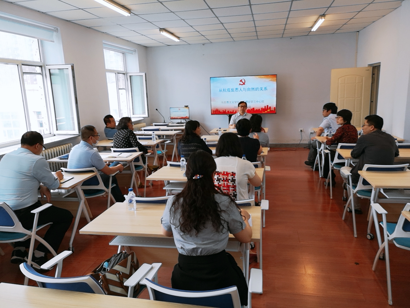 院长吴宏政为全体成员作了一场意义深刻的报告,题目为《从抗疫反思人与自然的关系》。报告指出,人与自然是生命共同体,新冠肺炎疫情发生以来,人与自然的关系问题构成了反思抗疫行动重大意义的一条主线。抗疫行动彰显了三重辩证关系。一是彰显了人的自然生命和精神生命的辩证关系。人既拥有自然生命,又拥有精神生命。疫情本身是对人的自然生命的威胁。但是,在抗击疫情中所彰显的是人的精神生命的力量。在抗疫中涌现了众多“最美逆行者”、抗疫英雄、先进人物和先进事迹,这些都构成了抗疫行动中的“精神生命”。因此,抗疫取得的成绩,是人在敬畏自然生命基础上的精神生命的胜利;二是彰显了人类中心主义与自然中心主义的辩证关系。西方传统敬畏自然和宗教文化背景下,提出了“集体免疫”的做法,这实质是一种片面的“自然中心主义”,是把生物学优胜劣汰的法则运用到了人类社会。然而,人类的主体性表现为对自然规律的把握和顺应,人类的可持续生存是最高的价值。因而,人类中心主义和自然中心主义的统一,是抗疫取得成功的重要原理;三是彰显了个体与共同体之间的辩证关系。抗疫是国家乃至人类共同体共同面对的使命。共同体是个体存在的真理,表现在抗疫中,就是个体对共同体抗疫制度、措施安排的贯彻落实。正如马克思所说,人是一切社会关系的总和。个体在社会制度的安排下投身于抗疫行动,达成了个体与共同体的真正和解。